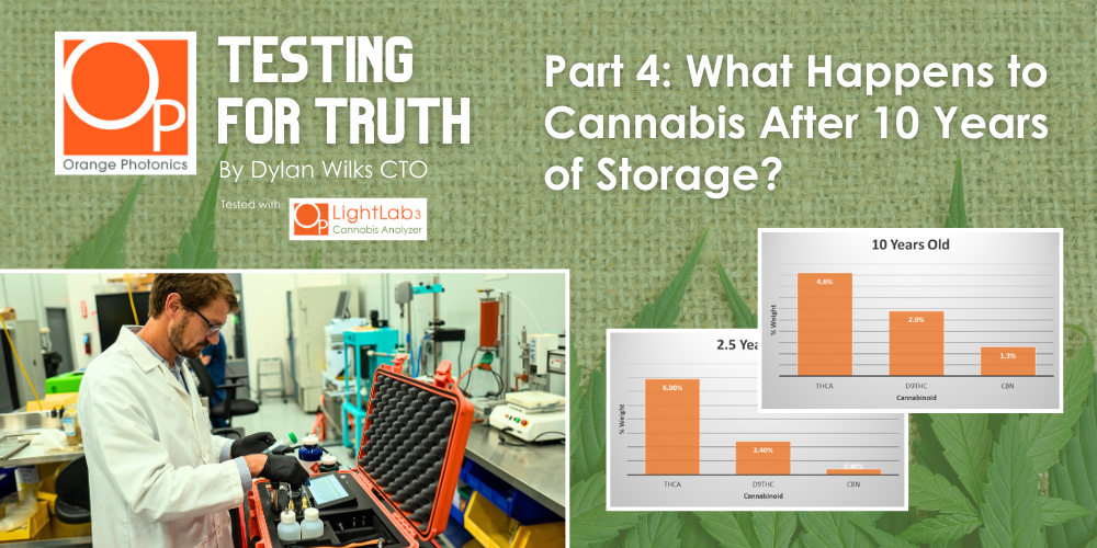 We prepared the 10-year-old cannabis sample as well as a 2.5 year old sample. Neither sample was exposed to significant light, heat or humidity during storage, so despite their age, the samples were treated reasonably well. Both samples along with a control fresh cannabis plant were homogenized and analyzed on a LightLab Cannabis Analyzer, which measured the levels of 6 cannabinoids.